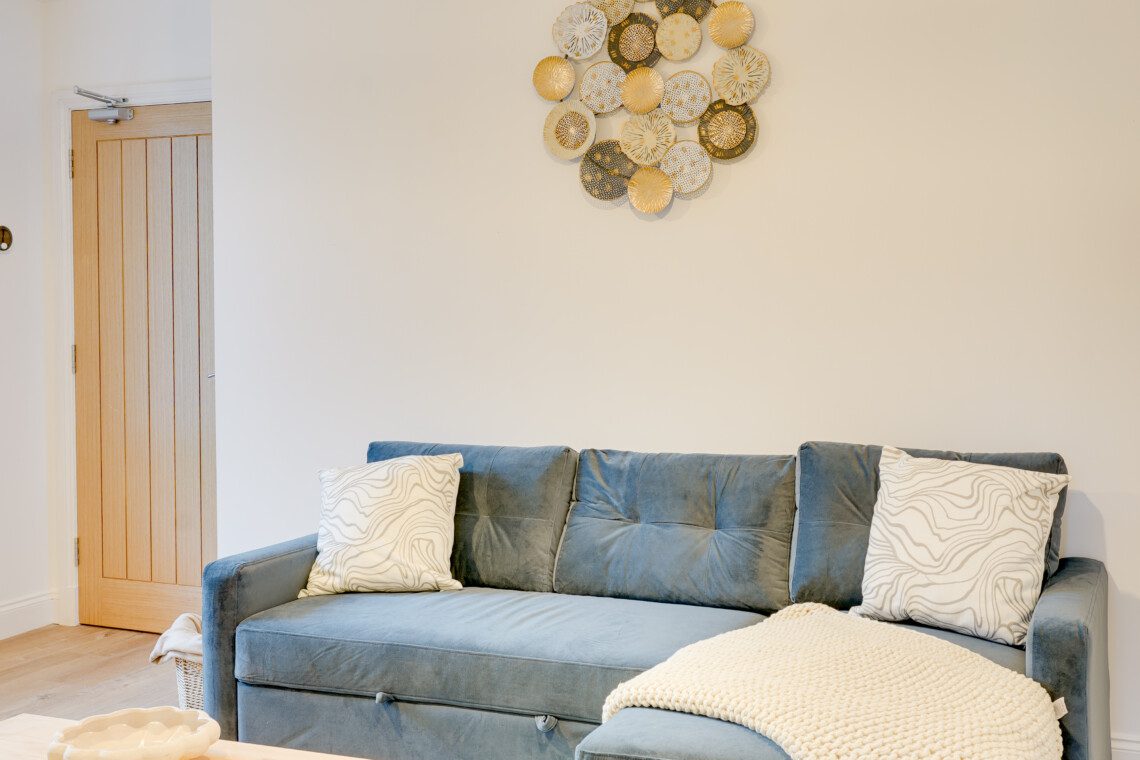 Through the internal door from the lounge, you’ll find the spacious bedroom, thoughtfully designed for comfort. It features a double bed, a wall-mounted Smart TV, and a freestanding wardrobe, providing a relaxing and practical space for your stay.